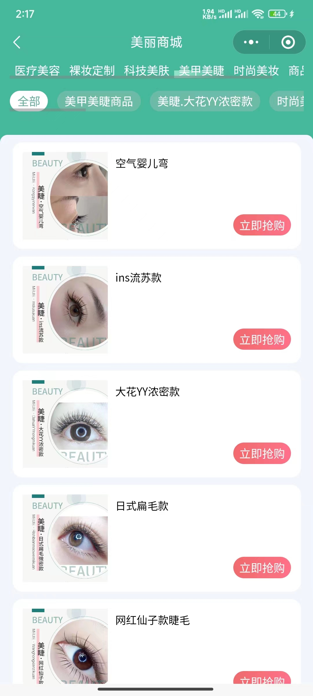 多样化的产品选项:用户可以在小程序中浏览不同款式和类型的美容产品,例如“大花YY浓密款”、“空气婴儿弯”、“ins流苏款”等。