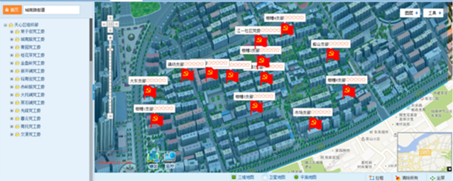 通过GIS地理信息平台,可以掌握我们辖区内党组织,包括工委、总支、支部分布的直管情况, 找组织,可详细了解到党组织的工作情况、党员情况、组织生活情况,及积分评定。