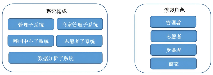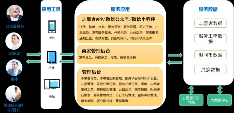 志愿者管理系统主要由管理后台、商家管理后台、志愿者APP、志愿者微信公众号、志愿者微信小程序、门户网站子系统、大数据中心几部分构成,并打造时间银行概念。