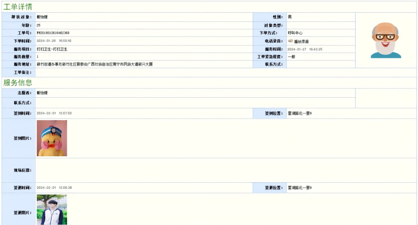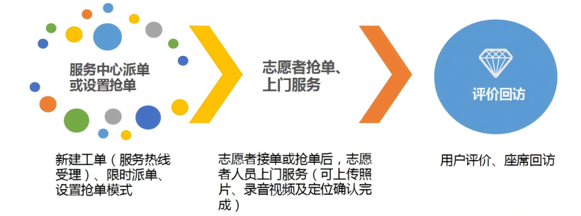 志愿者工单设计流程:新建工单(服务热线受理)、限时派单、设置抢单模式;志愿者接单或抢单后,志愿者人员上门服务(可上传照片、录音视频及定位确认完成);用户评价、座席回访、按月考核、按月结算。