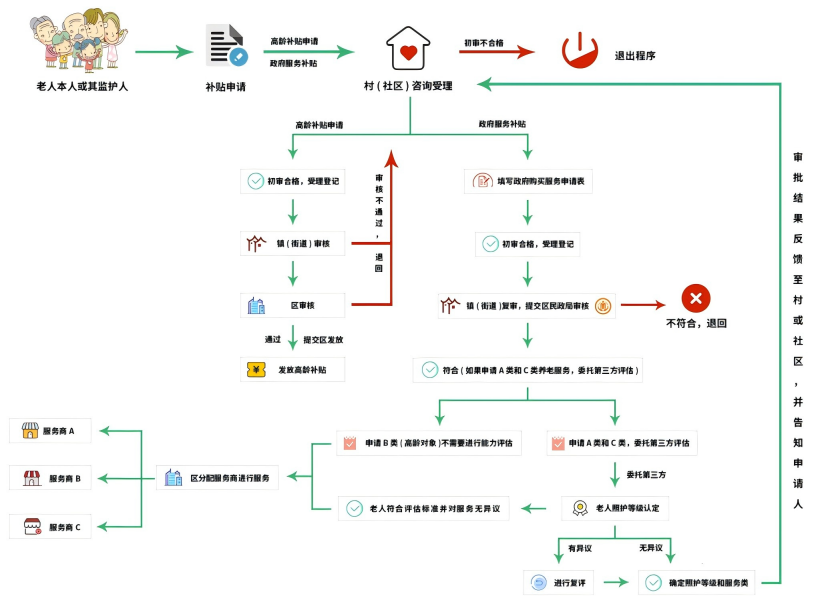 ② 实现审批电子化、补贴发放流程化:政府向法定的特殊和困难老年人提供以生活照料、健康护理、精神慰藉等为重点的居家养老服务的补助、政府向80周岁以上的老人给予高龄补贴。实现居家老人服务补贴和高龄津贴申请的录入、填报、审批等相关信息的填写、修改、上报等功能。