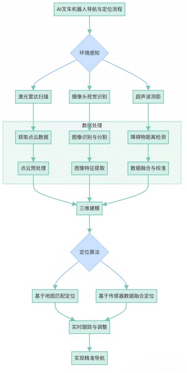 采用激光雷达、摄像头、惯性导航等多传感器融合技术,实时感知环境,构建地图并规划最优路径,实现叉车在复杂场地的自主导航和精准定位,避免碰撞,保障高效运行。